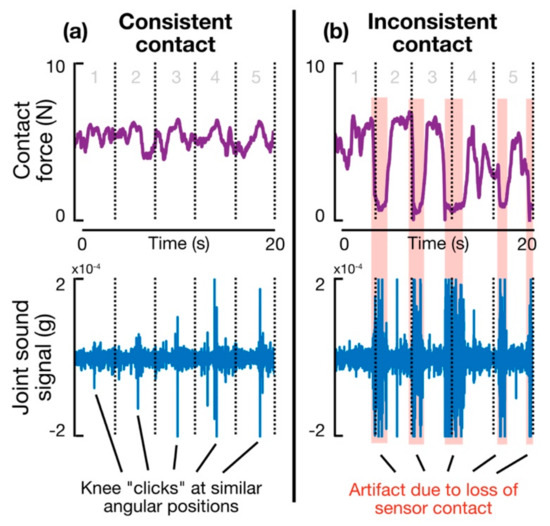 Fingertip contact force and joint sound signal waveforms for representative trials with (a) consistent and (b) inconsistent sensor–skin contact. Time duration of each waveform is 20 s, in which five seated knee flexion–extension cycles were completed at a rate of 4 s per cycle. Highlighted portions illustrate how a rapid decrease in contact force coincides with regions of the joint sound signal dominated by artifact. These data demonstrate that sensor-to-skin contact force can be used as a context clue for rejection of noisy, low-quality joint sound signals.