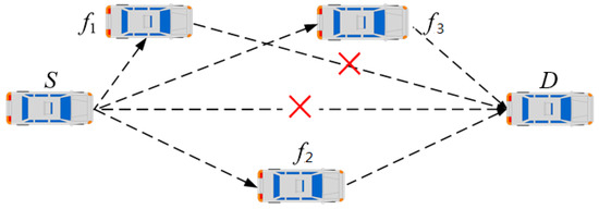 A typical VANET scenario is depicted in Figure 1. Vehicle S is the source node, and vehicle D is the destination node. All the vehicles have the same communication range r. Vehicles, including f, f, f, and D, are in the communication range of source node S. The destination node D cannot receive data from the source node S for reasons of channel fading or mobility. The other vehicles, namely, f, f, and f, are located between the source node S and the destination node D. Therefore, they become potential cooperative relaying nodes. In this case, vehicle f cannot forward data to vehicle D yet. Vehicle f is located in the middle place between the source node and the destination node, and then it is the ideal cooperative node. In order to promote the successful transmission rate, vehicle f can also be selected as a cooperative node to forward data to the destination node.