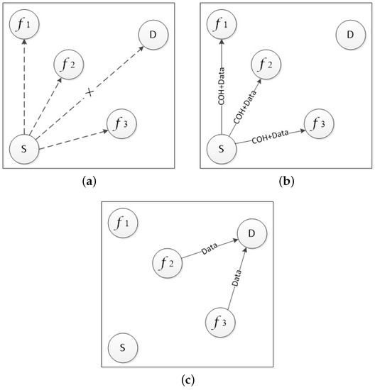 Figure 2 shows a typical cooperative process of the OCA-MAC protocol. When the sending node S determines its successful transmission rate of sending data to the receiving node D is below the predesigned value, node S will choose f, f, and f as potential cooperative nodes. We assume that the number of cooperation nodes is two in this scenario. When f, f, and f receive the packet with the cooperation header, they participate in the cooperative forwarding. In order to avoid excessive transmission overhead caused by redundant transmission, node f will give up forwarding if it detects the number of forwarding reaches the predesigned number K. If the receiving node D receives the redundant packets, it will drop the packet and avoid invalid overhead.