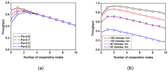 Figure 3 shows the network throughput with a different number of cooperative nodes when the number of time slots F is 60. Figure 3a shows the network throughput with a vehicle density of 75 vehicles per kilometer. It can be seen that the higher the successful rate of channel transmission, the higher the effective throughput of the network. Figure 3b shows the network throughput when the channel successful transmission rate is 0.75. With the increase of vehicle density, the growing numbers of vehicles participate in communication. Then, the channel time slot is fully utilized, and the network throughput is also increased.
