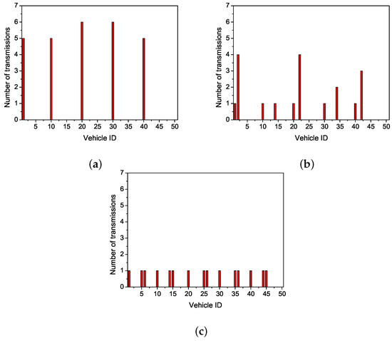 Comparisons of the number of transmissions. (a) multichannel TDMA MAC protocol (VeMAC). (b) cooperative ad hoc MAC protocol (CAH-MAC). (c) OCA-MAC.