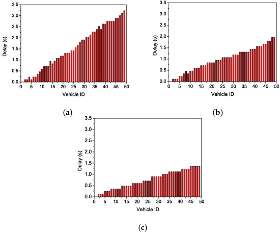 Comparisons of delay. (a) VeMAC. (b) CAH-MAC. (c) OCA-MAC.