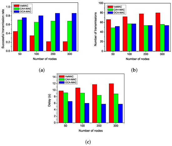 We can learn from Figure 6a that the successful transmission rate of OCA-MAC is nearly 300% higher than that of VeMAC and about 20% higher than that of CAH-MAC in the situation of 300 nodes. When the number of nodes is small, the gap between OCA-MAC and CAH-MAC is small. As the number of nodes grows, the number of available cooperative nodes increases. The successful transmission rate of CAH-MAC does not vary obviously due to the random choice of cooperative nodes. Meanwhile, OCA-MAC has more opportunities to choose better cooperative nodes. It can promote the successful transmission rate to a certain extent.
