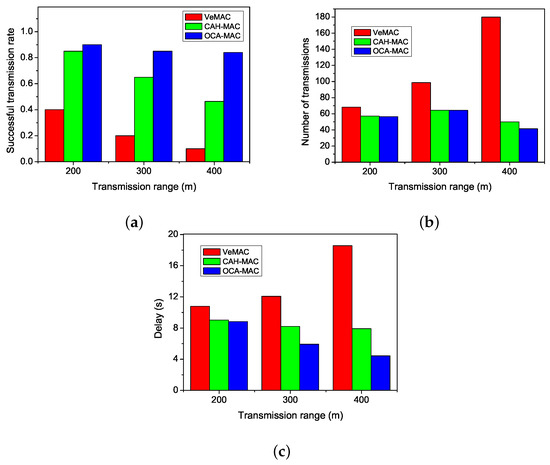Figure 7a indicates the relationship between successful transmission rate and transmission range. As the transmission range increases, the successful transmission rate of VeMAC evidently decreases. Compared to CAH-MAC, OCA-MAC improves the successful transmission rate by around 40% in the case of 400 m. When the transmission range increases, the number of available cooperative nodes also increases. OCA-MAC chooses the optimal cooperative nodes to forward data, but CAH-MAC only chooses cooperative nodes randomly. Therefore, OCA-MAC has a higher successful transmission rate than CAH-MAC.