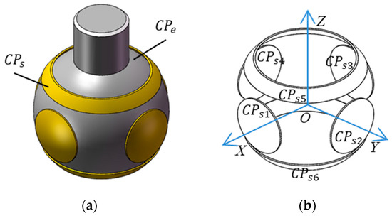 In the proposed capacitive sensor, the ball of the spherical joint is employed as a common excitation plate. Each sensing plate (CPsi, i = 1, 2, …, 6) and the common excitation plate (CPe) produce a capacitor (Ci, i = 1, 2, …, 6). Ideally, the clearance between the ball and six sensing plates is identical, and thus the capacitance value of the capacitor is equal to each other. Once the ball has an eccentric displacement, the center of the ball deviates from the sphere center of six sensing plates. As a result, the clearance between the ball and six sensing plates undergoes different variations, and the capacitance value of each capacitor alters correspondingly. Thus, the eccentric displacement of the ball in the socket could be obtained by detecting the variation of the capacitance values of six capacitors.
