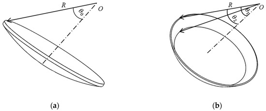 To explore the effect of the plate structure on the capacitive fringe effect, two spherical capacitive plates are examined. The spherical-cap capacitive plate proposed in this work is shown in Figure 5a while the spherically-trapezoid capacitive plate proposed in [22] is presented in Figure 5b. The central angle of the spherical-cap capacitive plate is of 30°. The spherical radius of the inner surface for both capacitive plates is of 25 mm and the effective area of two plates is equal to each other. The material of the capacitive plates is copper and the dielectric material is air. The size of simulation domain is four times that of the model to fully reflect the effect of the fringe effect on the capacitance.