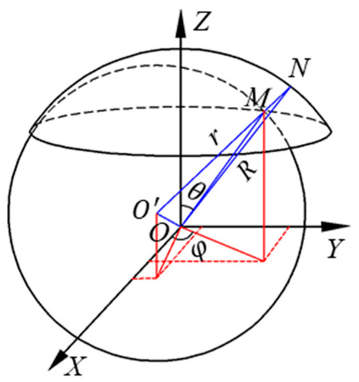 Figure 3 presents the schematic model for calculating the eccentric displacement of the ball. The surfaces of the sensing plates and the ball are assumed to be ideal spheres. The sphere center of sensing plates coincides with the origin O of the coordinate system OXYZ, and the center of the ball is denoted by the point O′. δ is the eccentric displacement from the center O′ of the ball to the sphere center O of sensing plates. The point M locates on the surface of the ball. θ is the angle between the line OM and the Z-axis. φ is the angle between the line OM and the X-axis. N is the intersection point of the extension of the line O′M and the inner surface of sensing plates. R is the inner radius of the sensing plates and r is the radius of the ball. Thus, the clearance d between the ball and the sensing plates at the point M is denoted by the distance from point M to point N. It can be expressed by the following equation: