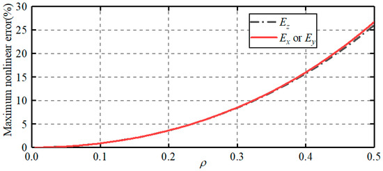Figure 4 presents the dependence of the maximum nonlinear error on the eccentricity of the ball. The eccentricity of the ball ρ is defined by . As shown in Figure 4, the maximum nonlinear errors caused by the high-order terms exhibit a quasi-exponential increase with the rising eccentricity of the ball. The maximum nonlinear errors are of 0.88% and 3.62% at the eccentricity ρ = 0.1 and ρ = 0.2, respectively. Thus, the effect of the high-order terms on the differential capacitance can be neglected, provided that the eccentricity of the ball is small. As such, the dependence of the differential capacitances (ΔCx, ΔCy and ΔCz) on the eccentric displacements (δx, δy and δz) can be described by linear functions,