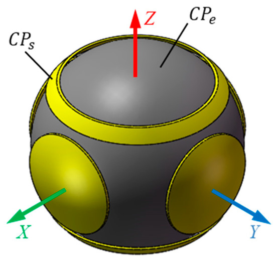 The proposed capacitive sensor consists of a ball and six spherical plates (Figure 1). The former is the excitation plate (CPe) while the latter are sensing plates (CPsi, i = 1, 2, …, 6). The six sensing plates have the same thickness and area. They are concentrically distributed around the ball. As a result, the sphere center of six spherical plates coincides with the rotational center of the ball. As shown in Figure 1b, the coordinate system OXYZ is defined in the sensor with the origin O at the rotational center of the ball, the X-axis is chosen along the centerline of plate CPs1 and the Y-axis is defined along the centerline of the plate CPs2. In this work, the proposed sensing plates have a structure of the spherical cap (Figure 2). The central angle subtended from the apex of the cap to the edge of the cap for the plates CPs1 ~ CPs4 is θ0, while that for the plates CPs5 and CPs6 is θ1 and θ2, due to the motion requirement of the output rod of spherical joints. To achieve the insulation between the sensing plates and the excitation plate, a dielectric material with lubricating and abrasion-resistant properties is deposited on the inner surface of the sensing plates.