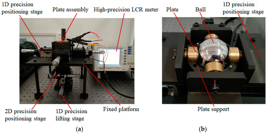 In this work, an experimental investigation is carried out to validate the feasibility of the proposed method. The experimental setup mainly consists of one-dimensional (1D) precision positioning stage, two-dimensional (2D) positioning stage, 1D precision lifting stage, plate assembly, fixed platform and high-precision LCR meter (Figure 7a). The plate assembly includes six plates, a ball and two plate supports (Figure 7b). The 1D precision positioning stages are attached to plates, while the 2D positioning stage and 1D precision lifting stage are connected to the ball. The material of the plate and the plate supports is copper and aluminum, respectively. The surfaces of the plate supports are hard oxidized to ensure the insulation between the plates and the plate supports.