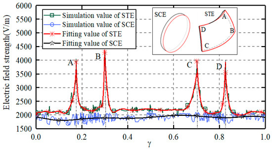 Figure 10 presents the magnitude distribution of the electric field strength along the edge of the capacitive plates. The theoretical and simulated values are further fitted with a ninth-order polynomial for a better comparison. γ is the dimensionless distance normalized by the perimeter of the sensing plate. The clearance between the ball and the sensing plate is of 1.2 mm and the plate thickness is of 2 mm. In case of the spherically-trapezoid plate, the electrons concentrate at the tip of the capacitive plate, resulting an enhanced divergence of the electric field line at the tip. Thus, the electric field strength at the tips A, B, C and D is much larger than that in other places and the capacitive fringe effect becomes more serious. In case of the spherical-cap plate, the electric field strength is relatively uniform along the edge of the capacitive plate. Thus, the proposed capacitive sensor in this work could reduce the capacitive fringe effect and improve the measurement accuracy.
