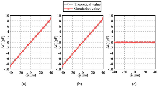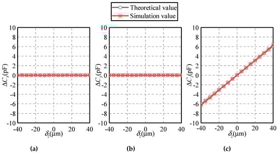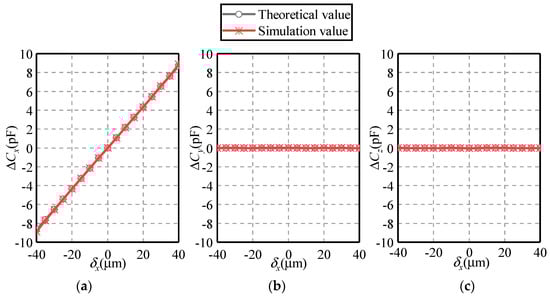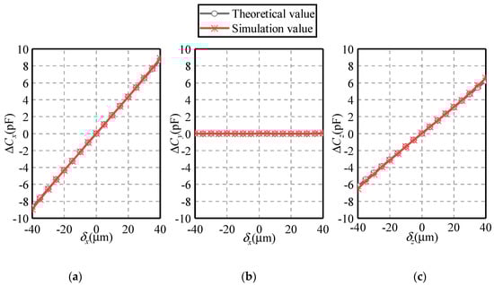 Figure 11 and Figure 12 present the dependence of the differential capacitances ΔCx, ΔCy and ΔCz on the eccentric displacements along the X and Z axes, respectively. The eccentric displacement δx or δz varies from −40 to 40 µm, with a step of 5 µm. The maximal eccentricity of the ball is 0.2. Three observations can be made. First, the simulated values of differential capacitances agree well with their theoretical counterparts, exhibiting a similar variation tendency. This indicates the feasibility and effectivity of the proposed method. Second, if the eccentric displacement is along the X-axis, the variation of ΔCy and ΔCz exhibits a different trend with that of ΔCx. As δx rises from −40 to 40 µm, ΔCx goes up linearly from −9 to 9 pF while ΔCy and ΔCz remain to zero. This indicates the decoupled effect of the displacement along the three directions, which is consistent with Equations (1)–(3). Third, if the eccentric displacement is along the Z-axis, ΔCx and ΔCy remain unchanged, while ΔCz exhibits a linear relationship with δz.