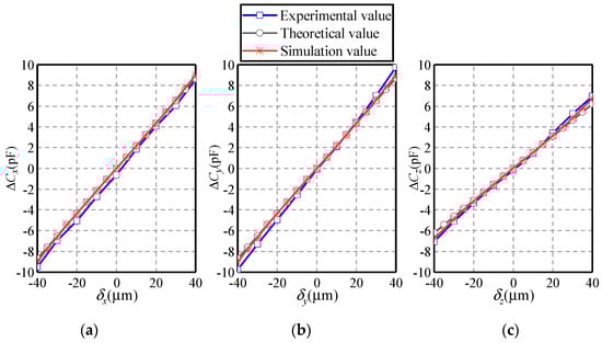 Figure 15 presents the dependence of the differential capacitances ΔCx, ΔCy and ΔCz on the eccentric displacement along the X = Y = Z direction. The eccentric displacements δx = δy = δz vary from −40 to 40 µm. The eccentricity of the ball is less than 0.346. Several observations can be made. Firstly, the variation of the simulated values of the differential capacitances exhibit a similar trend with that of the theoretical ones. Secondly, as the eccentric displacement rises from −40 to 40 µm, ΔCx, ΔCy and ΔCz increase linearly. Note that the increasing magnitude of ΔCz is less than that of ΔCx and ΔCy, suggesting that the sensitivity of capacitor pair Cz is less than that of Cx and Cy. Thirdly, the experimental values of the differential capacitances ΔCx, ΔCy and ΔCz present a similar variation tendency with the simulated and theoretical counterparts. This indicates the feasibility of the proposed detection method. Note that the experimental values in ΔCx exhibit an averaged relative derivation of 10.91% from simulated values and of 10.90% from theoretical values. This can be ascribed to the manufacturing and installation errors of the plates and the ball.