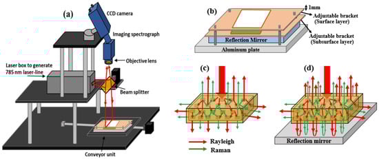 Schematic diagram of line-scan Raman imaging system (a), sample holder with reflection mirror to facilitate layered samples (b), and schematic representation of Raman signals collated without (c) and with a back-reflection mirror (d).
