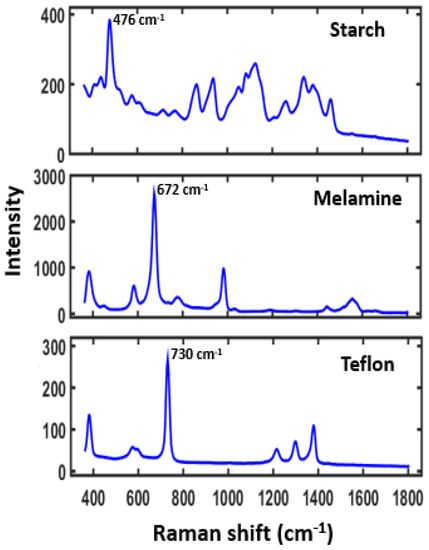 Raman spectra of starch, melamine, and Teflon used in this study to form subsurface and surface layers.