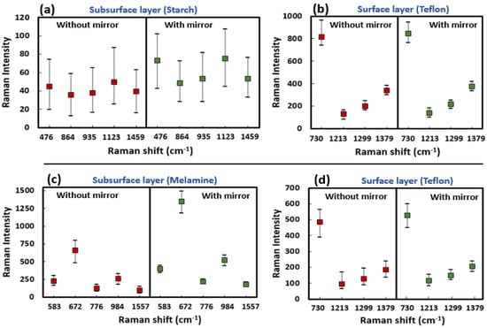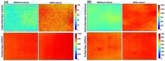 For S1, it was observed that the average Raman signal intensity of the bottom layer increased by an improvement factor of between 1.35 and 1.62 for 1459 cm−1 and 476 cm−1, respectively, among five selected peaks of starch (Figure 4a). In contrast, when the Raman images were acquired with the mirror, no notable improvement in Raman intensity of the superficial layer was observed.