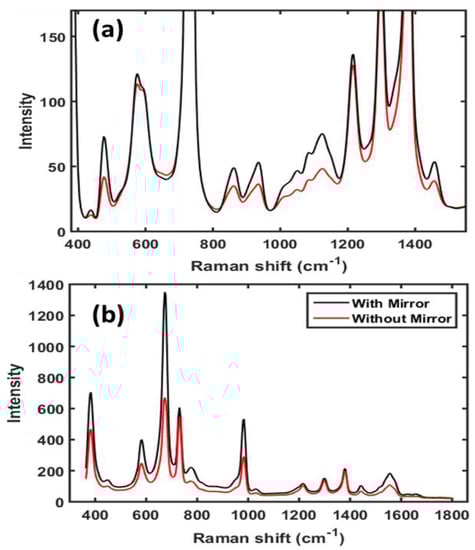 Raman spectroscopy with an imaging component called Raman imaging has become a versatile analytical technique with wide use, spanning from agro-food and pharmaceutical analysis, biological and biochemical sectors, forensic science, material science analysis, and art work, to name a few [,,,]. The main advantage of Raman spectroscopy over near-infrared (NIR) spectroscopy is that Raman spectra show distinct and well-resolved peaks, and a big advantage of using Raman spectroscopy over infrared (IR) is that the sample preparation is much easier and less time consuming. Despite its advantage, the major drawback of Raman spectroscopy is the fact that the Raman scattering is usually weak, thus it suffers from low signal intensity. In general, Raman signal intensity can be conventionally improved by using a high power laser source and/or by increasing the exposure time, thus allowing more photons to reach the detector. However, these typical solutions can lead to sample destruction and prolong the scanning process, respectively. Resonance Raman spectroscopy is another way to increase the Raman signals by choosing an excitation (laser) wavelength carefully to match with the electronic absorption bands of a compound or material of interest. Such a combination can result in scattering intensities which increase several fold []. Since this technique is sample-centric, it cannot be considered a global solution of the aforementioned problems associated with Raman spectroscopy.