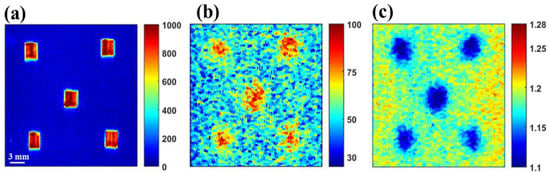 Raman band (1000 cm−1) images of polystyrene crystals exposed to the laser without any cover (a), covered with a 2 mm thick layer of wheat flour (b), and the spectral angle mapper (SAM) rule image of polystyrene crystals covered with a 2 mm thick layer of wheat flour (c). The intensity scales are in arbitrary units.