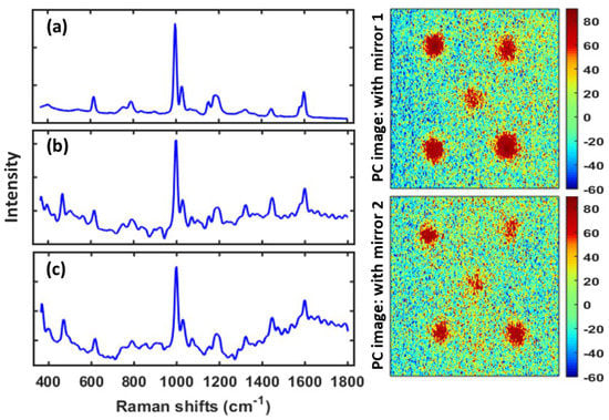 Figure 7 reports the results of the PCA analysis conducted on specimen S4 scanned with the reflection mirror. Figure 7a shows the Raman spectrum of polystyrene, and the calculated PCA loading plots are given in Figure 7b,c for replications 1 and 2, respectively. The Raman peaks of the concealed polystyrene are evident from the PCA loadings. The PCA images (distribution map) corresponding to the loadings were generated to illustrate the spatial position and reveal the concealed polystyrene pieces as shown in Figure 7. It should be noted that the concealed polystyrene pieces were not detected in specimen S4 when scanned without the reflection mirror. This is possibly because of the aforementioned reasons where the transmitted Raman signals from the hidden polystyrene pieces were reflected back by the background mirror toward the detector, thus contributing to the improvement in Raman intensity and S/N ratio, and eventually detected in the generated chemical images. In contrast, when the map was acquired with conventional Raman without the mirror, the relatively low signals which originated from the base materials were overwhelmed by the signals from the superficial layer and thus essentially lost. This is also apparent from the SAM generated rule images of the same specimen S4, where the concealed polystyrene pieces can be clearly visualized for data collected with the mirror (Figure 8). Nevertheless, unlike the PCA images of specimen S4 collected without the mirror, SAM rule images of the same sample show small evidence of hidden polystyrene (left upper part of the images on the upper row). This is probably because of the supervised nature of SAM analysis. Moreover, this particular piece of polystyrene was slightly thicker than the other pieces, therefore, it possibly generates a relatively higher amount of Raman signals, and thus it is detectable in the SAM rule images. It should be noted that the polystyrene piece buried at the center of the sample was the thinnest and relatively smaller in size, hence generating comparatively less Raman signals and is completely unnoticeable in conventional Raman images, but is evident when measured on the reflection mirror, though not as notably as the other hidden pieces of polystyrene.
