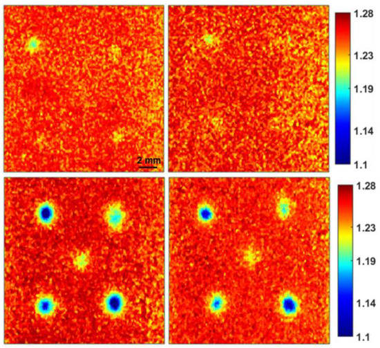 The preprocessed Raman band images (as marked in Figure 2) of both surface and subsurface materials for both S1 & S2 are shown in Figure 3a,b, respectively. The conventional Raman imaging data acquired without the reflection mirror shows comparatively lower intensity for the subsurface layer than those data collected with the reflection mirror. However, it is worth mentioning there are no notable differences in Raman intensity with respect to the surface layer of Teflon. This is also apparent from the plot (Figure 4) for the comparison of Raman intensities of the specific peaks of surface and subsurface layers of S1 and S2 samples scanned with and without the reflection mirror. To easily convey the increase in Raman signals from the subsurface layer, a Raman improvement factor was calculated as the average of the ratio of the peak intensity for each identical Raman peak of preprocessed Raman data collected with and without the reflection mirror.