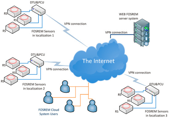 The Fiber-Optic Rotational Seismograph (FOSREM®) cloud system with samples FOSREM Sensors localization [16]. DTU: data transmission units. PCU: power communication units. VPN: virtual private network.