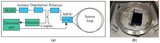The optical part of the sensor according to a minimum gyro configuration: (a) block diagram, (b) technical realization for FOSREM-1. MIOC: multifunction integrated optic chip. SLED: superluminescent light emitting diode.