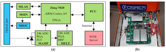 The electronic part of the sensor: (a) block diagram, (b) technical realization for FOSREM-1. MLAS: module of SLED controller, MSIN: module of sine signal generation, MIOC: module of signal generator for MIOC, MAMP: module of amplifier, MFLT: module of filter, FPGA: field programmable gate array, PGA: prograsmmable gain amplifier, FLT: low-pass filter, BRF: band-rejected filter.