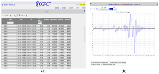 Print Screen for WEB FOSREM: (a) screen with selected and stored system events, (b) example of recorded seismic torsion event.
