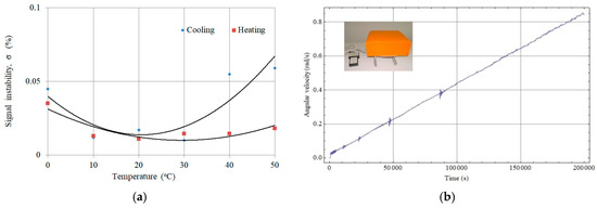 The proper FOSREMs’ work required in the first step their calibration by determination of optical and electrical constants (So, Se). It was made on the basis of the Earth rotation measurement, according to the procedure described in detail in our previous paper [10]. Several experimental tests were carried out to confirm FOSREMs’ parameters and reliability, including experimental uncertainties calculation based on the registration of the rotational component of the Earth at a different frequency bandpass [19], recording strong rotation motion with a new setup using earthquake simulation [11], and other. As an example, in Figure 5a a thermal test in a climate chamber VCL 7010 (Votsch Industrietechnik, Balingen-Frommern - Germany) at the temperature range of 0–50 °C for FOSREM-2 is presented [19]. As one can see, the recorded thermal instability of an output signal is less than 0.06%/°C, including the cooling and heating cycle. Similarly, we obtained a good linearity for FOSREMs regarding detection rotation with a high angular velocity up to radian per second (limitation of used measurement equipment), which is presented in Figure 5b. The observed perturbation for an angular velocity of around 0.05, 0.10, 0.22, and 0.38 rad/s is connected with the resonant characteristics of the rotation table.