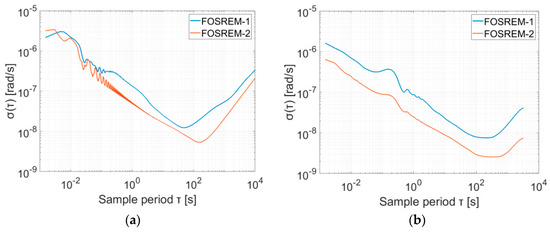 The Allan variance analysis for FOSREM-1 and -2 determined from the data gathered in various positions of the FOSREMs: (a) sensors were placed on the sturdy flat floor in the basement of the laboratory; (b) sensors were placed on the active optical table.