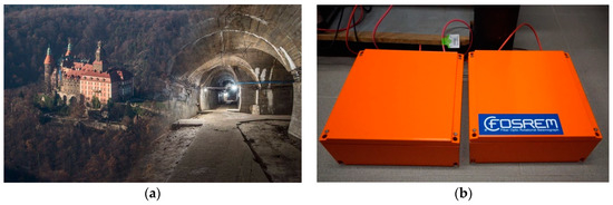 FOSREMs’ field application: (a) Książ castle with view of the underground tunnel located below the surface of the castle, (b) mounted devices in the geophysical observatory.
