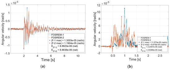 Figure 9 presents the exemplary data of the recorded torsion and tilt by two installed devices. Every figure also shows information about the absolute value of the signal maximal amplitude (|F-1 max|, |F-2 max|), as well as an EF—energy coefficient (E|F-1|, E|F-2|)—calculated numerically using a method of rectangles of the Riemann integral for FOSREM-1 and FOSREM-2, respectively.