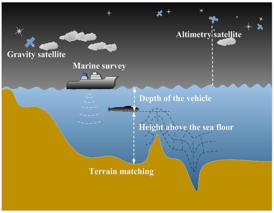 The geophysical field is united with the INS to form the passive navigation system to solve the positioning error of INS that accumulates over time. At present, the underwater technologies for long-term hidden navigation can be aided by terrain, gravity, and geomagnetism. Due to the long- and short-term variations in the geomagnetic field, it is difficult to obtain a high-precision geomagnetic map. Additionally, magnetic measurement has its own limitations, such as magnetic interference [5]. The gravity field [6,7,8,9,10] and terrain are the main technical means of auxiliary navigation. Terrain has been studied previously, and terrain matching navigation has been used for decades in land and air equipment, e.g., in aircraft and cruise missiles. This technique also has been applied in underwater vehicles, as shown in Figure 1. In the research within the development strategy “Technology for the United States Navy in 2000–2035”, the goal of improving the accuracy of underwater vehicle navigation using terrain matching technology was introduced [11,12,13].