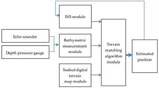 The composition of the basic module of the underwater terrain matching navigation system is shown in Figure 2 [27,28], including the INS module, the seabed digital terrain map module, the bathymetric measurement module, and the terrain matching algorithm module. The INS module provides the key navigation information. The seabed digital terrain map module is usually represented by a digital bathymetric map. The bathymetric measurement module provides the depth at certain points on the sea floor relative to a defined vertical datum. There are numerous vertical datums, with Mean Sea Level (MSL) being the most widely used. The depth of the underwater vehicle is measured by a depth pressure gauge, and the height of the underwater vehicle relative to the sea floor is measured by an echo-sounder. The terrain matching algorithm module is designed to use a set of bathymetric measurements to build a terrain profile, and then find an optimal position estimate by comparing it with a prior map database.