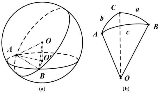 We assumed that the earth is a standard unit sphere, as shown in Figure 6a. The shortest distance between point A and B is a great circle arc corresponding to the center of the circle rather than the arc on the latitudinal coil.