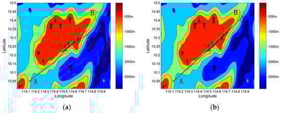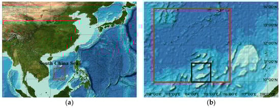 The resolution of original seabed digital terrain map was 0.5’ × 0.5’ in this experiment, which can be interpolated onto a grid with 100 × 100 m resolution, which provided a good base for us to use the terrain database for auxiliary navigation. The General Bathymetric Chart of the Oceans data was used in the study. The study area was located in the South China Sea (solid line box, Figure 7), ranging between longitude 114°–115° E and latitude 10°–11° N, as shown in Figure 7.