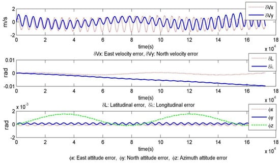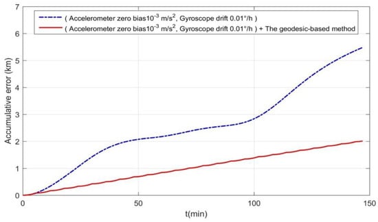 As shown in Figure 11, the parameters were set as follows: gyroscope drift 0.01°/h, accelerometer zero bias 10−3 m/s2, velocity 10 m/s, initial position error 0 m, velocity error 0.03 m/s, and period of geodesic-based method (T = 360 s).