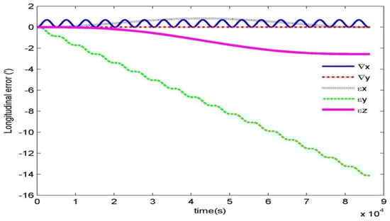 As shown in Figure 9, for the INS, the latitudinal error shows cyclical period changes and the longitudinal error accumulates over time. Figure 10 shows the influence of the gyroscope drifts ( ε x , ε y , ε z ) and accelerometer zero bias ( x , y ) on longitudinal error. The impact analysis follows.