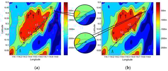 Figure 13a depicts the terrain matching map. When the underwater vehicle reached destination B, the navigation error between the inertial trajectory and the real trajectory was large. Without the geodesic-based method, the navigation error accumulates quickly over time. As shown in Figure 12 (dotted line), the accumulative navigation error was about 2 km/h.