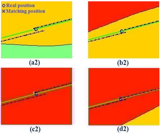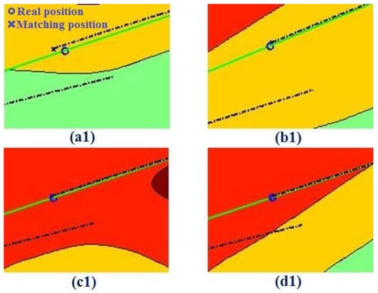Figure 14 depicts the schematic diagram of the terrain matching points, where the dotted line displays the inertial trajectory and the solid line displays the real trajectory (corresponding to Figure 13a). Table 1 lists the statistical results from Figure 14. According to a1, b1, c1, and d1 in Table 1, the circular error probable (CEP) before matching (the error between the inertial position and the real position) is large (about 1.3 km). Therefore, the search matching time is about 9.84 s. After matching, the matching position is better than the inertial position. As shown in Table 1 for b1, c1, and d1, the positioning accuracy (the error between the matching position and the real position) is within 100 m, and the effect of the positioning accuracy is better than for a1, which reaches 310.2 m. The suitability of terrain near the matching point a1 is slightly worse than that of the other three positions, and there may be many sets of bathymetric measurements with high similarity in the matching area.