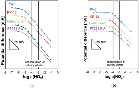 The calibration curves of the NO3-ISFETs are shown in Figure 2a. The y axis shows the potential difference and the x axis shows the logarithm of the nitrate activity. The calibration curves are arranged by the starting points so that they are easier to understand. Therefore, we insert the indicator of the slope sensitivity in Figure 2. All NO3-ISFETs show a linear response to nitrate activity in the range 10−5 M to 10−1 M. The selectivity of the ISFETs is represented by the selectivity coefficients defined by the Nicolsky–Eisenman equation. Selectivity coefficients for typical anions were measured by the mixed solution method and are summarized in Table 1. We obtained acceptable selectivity for salivary nitrate determination. The linear response range and the selectivity coefficients of the polyurethane-based ISFETs coincide with those of the PVC-based ISFETs. Therefore, potential determinants are ionophore and plasticizer but not matrix membrane. The calibration curves in artificial saliva are shown in Figure 2b. All ISFETs show a linear response to nitrate activity in the range of 10−4 M to 10−1 M. The concentration range of nitrate in saliva is approximately 10−4 M to 10−3 M [21]. Therefore, the NO3-ISFETs are adapted to nitrate measurement in saliva.