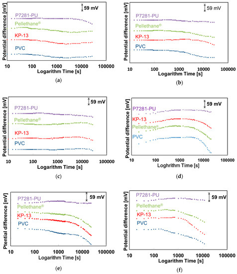 However, the cause of drift is not clear, and it is currently being investigated using matrix membranes that have the same molecular structure as P7281-PU but only differ in molecular weight. In any case, P7281-PU is an effective matrix membrane for NO3-ISFETs for measurement of saliva. In the future, it can be expected to achieve continuous nitrate monitoring and deployment to wearable sensors. In addition, we could conduct further experiments in different pH or temperature solutions to elucidate the cause of the drift.