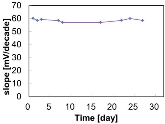 The drift characteristics in saliva and various solutions are shown in Figure 3. The y axis shows the potential difference and the x axis shows the logarithm of time. The results of drift are arranged by the starting points so that they are easier to understand. Therefore, we insert the indicator of the potential difference in Figure 2. In standard solution and CO2 solution, all NO3-ISFETs show a comparatively stable response (see Figure 3a,c). In mucin solution, the PVC-based ISFETs show drifts slightly, but the polyurethane-based ISFETs show a comparatively stable response (see Figure 3c). The results of Figure 3c suggest that CO2 is not the cause of drift. Furthermore, mucin is the cause of drift for PVC-based ISFETs but less so for the polyurethane-based ISFETs. PVC, KP-13, and Pellethane®-based ISFETs show drift in salivary samples (see Figure 3d–f). However, P7281-PU-based ISFETs show a comparatively stable response in salivary samples. Figure 4 shows the long-term stability of P7281-PU-based ISFETs. The y axis shows the slope sensitivity and the x axis shows the time. P7281-PU-based ISFETs maintain the same slope sensitivity for at least 27 days. It is considered that the stable response of the P7281-PU-based ISFETs is due to the strong adhesion of the ion-selective membrane to the Ta2O5 gate and that the formation of water layer at the ISM/gate interface is prevented.