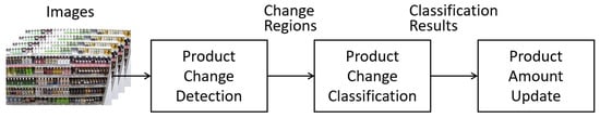 The proposed method robustly monitors the shelves by detecting and classifying changes in products regarding increases/decreases in product amount, such as “product taken (decrease)” and “product replenished/returned (increase)”, using images from a surveillance camera and by updating the shelf condition representing presence/absence of products on the front of the shelves from the initial shelf condition given in advance. Background subtraction (or foreground detection) [19,20,21], which is a widely used approach for detecting changes in images as foregrounds, cannot distinguish between “product taken” and “product replenished/returned” since it detects regions that do not match a reference image, often called “background image” or “background model”. Hence, background subtraction alone is not sufficient for robustly monitoring the shelves for maintaining high on-shelf availability. To solve this problem, we need to classify the changes in the image into the actual changes in products on the shelves, such as “product taken” and “product replenished/returned”. The process flow of our method consists of three blocks as shown in Figure 2. It first detects change regions of the shelves in the image by background subtraction on the basis of statistical information of pixels. To reduce false positives of change regions such as shoppers, it tracks detected foregrounds between consecutive images and removes them on the basis of their moving distance. It then classifies the detected change regions into four classes representing the actual changes on the shelves by supervised learning using convolutional neural networks (CNNs) [22]. It finally updates the shelf condition representing presence/absence of products on the front of the shelves using classification results and computes the product amount visible in the image as on-shelf availability.