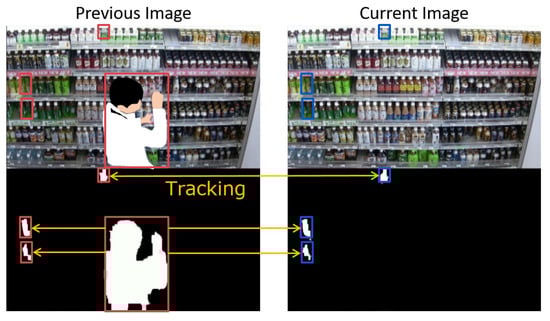 Figure 3 shows an example of detecting and tracking the foregrounds. Left and right images show the previous and current images, respectively. Top and bottom images show an input image and the foregrounds, respectively. Note that the person in the top-left image is retouched for privacy protection. Here, three small foregrounds and one large foreground are detected in the previous image and three small foregrounds are detected in the current image. Our method accurately detects only the changes in products even when the shoppers stand in front of the shelves by tracking the foregrounds between the consecutive images on the basis of three similarities by using the Hungarian method.