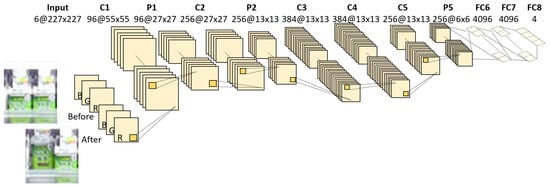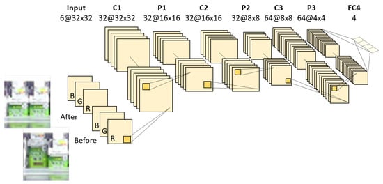 In this paper, we try two networks for classifying the detected change regions: a CIFAR-10-based network shown in Figure 4 and a CaffeNet-based network (http://caffe.berkeleyvision.org/) shown in Figure 5. The input and final fully-connected layers in both networks are modified compared with those of the original networks. These networks are learned using training samples collected from videos taken in real stores. Input data of our network are six-channel images constructed from images before and after the change as shown in Figure 4 and Figure 5. Zhao et al. [24] proposed a method to classify difference images by deep neural networks. However, it cannot distinguish the actual changes on the shelves such as “product taken” and “product replenished/returned” since they are essentially symmetrical operations (i.e., the difference images of those change regions are almost identical) as shown in Figure 6. Therefore, we use the six-channel images to which no extra operations are applied as input data of our network. Note that the images before and after the change are resized to pixels for the CIFAR-10-based network or pixels for the CaffeNet-based network before constructing the six-channel image.