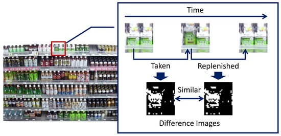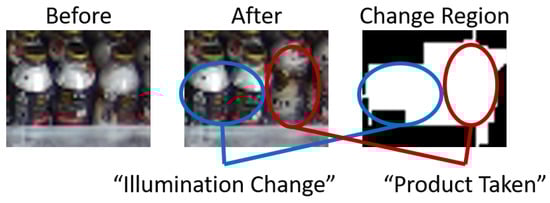 Examples of difference images for change regions of “product taken” and “product replenished”.