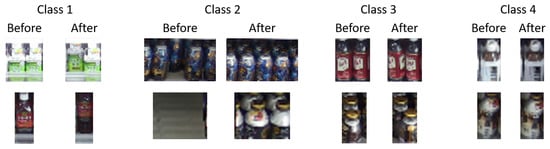 Our network classifies the detected change regions into four classes shown in Table 1. Examples of images for each class are shown in Figure 7. Classes 1 and 2 show “product taken” and “product replenished/returned”, respectively. Class 3 shows that the position or direction of a product slightly changed since a shopper touched it. Class 4 shows false positives unrelated to human movement, such as illumination changes. Classes 1 and 2 show that the product amount on the shelves decreases or increases, respectively, whereas classes 3 and 4 show that the product amount on the shelves does not change.