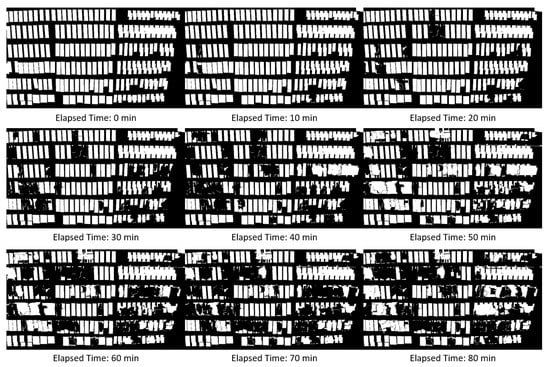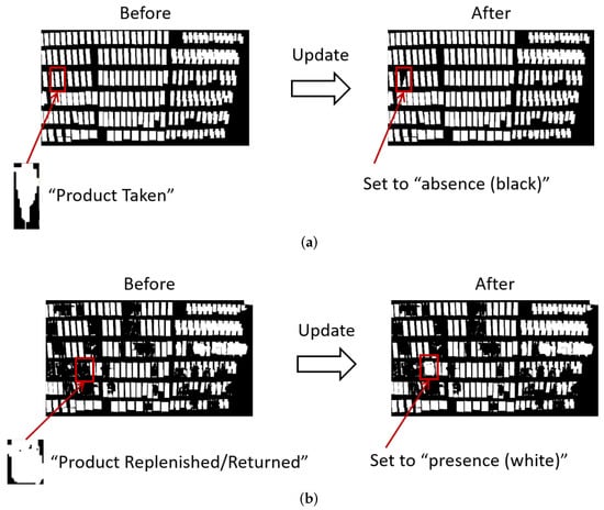 Figure 8 shows examples of the shelf condition represented as a binary image. Left and right images are the shelf condition before and after an update, respectively. The white and black regions of the shelf condition show “presence” and “absence” of products, respectively. When the classification results are “product taken (class 1)”, the shelf condition corresponding to the change regions is set to “absence (black)” as shown in Figure 8a. When the classification results are “product replenished/returned (class 2)”, the shelf condition corresponding to the change regions is set to “presence (white)” as shown in Figure 8b. The shelf condition is not changed in the case of other classification results (classes 3 and 4).