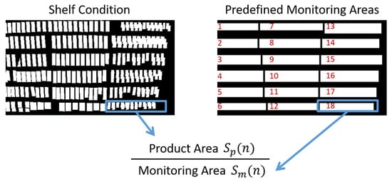 where is on-shelf availability for the nth shelf. and are the product areas of the nth shelf (i.e., the number of white pixels in the shelf condition corresponding to the nth shelf) and nth monitoring area (i.e., the number of pixels in the nth monitoring area), respectively. Figure 11 shows an overview of computing on-shelf availability for the nth shelf. When some products are taken/replenished simultaneously as shown in the lower example of class 2 in Figure 7, on-shelf availability increases/decreases on the basis of the summation of changed areas.